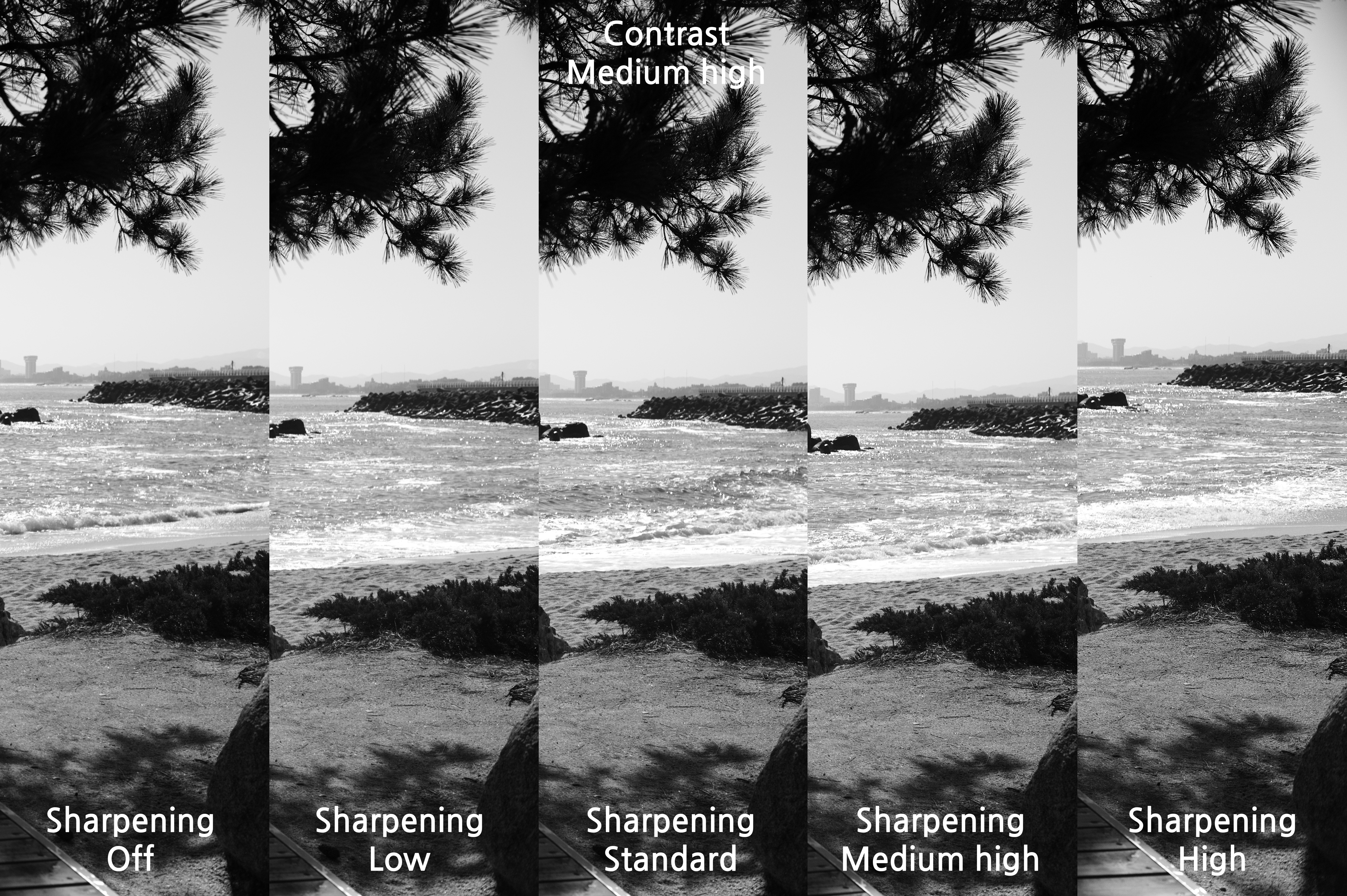 그래서 대비를 Medium high로 했을 때를 선명도에 따라 어떤 차이가 있는지 살펴 보았다.