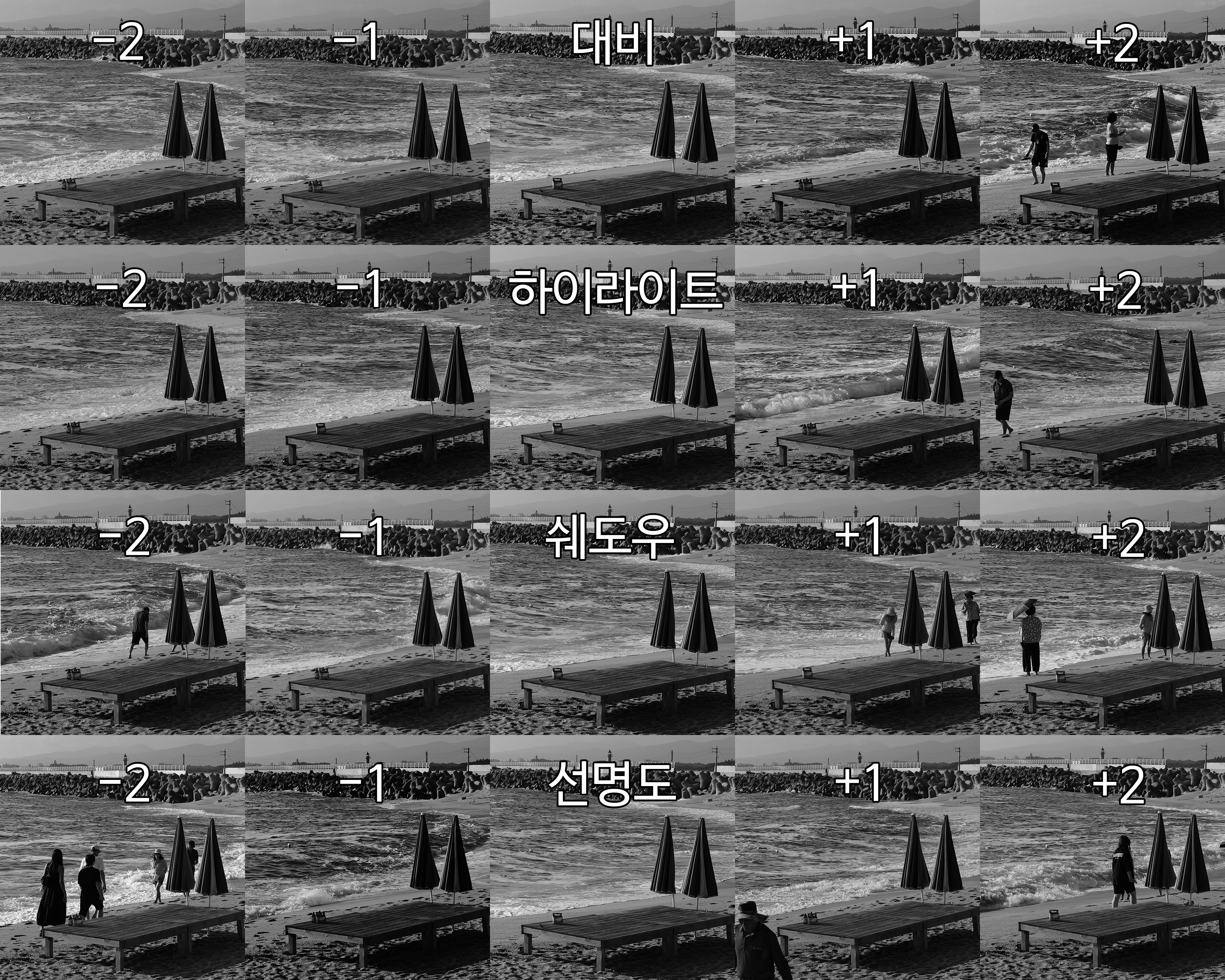 그런데 Q3는 고대흑백비 설정에 들어가면 대비, 하이라이트, 쉐도우, 선명도를 각각 -2, -1, 0, 1, 2로 설정할 수 있다.