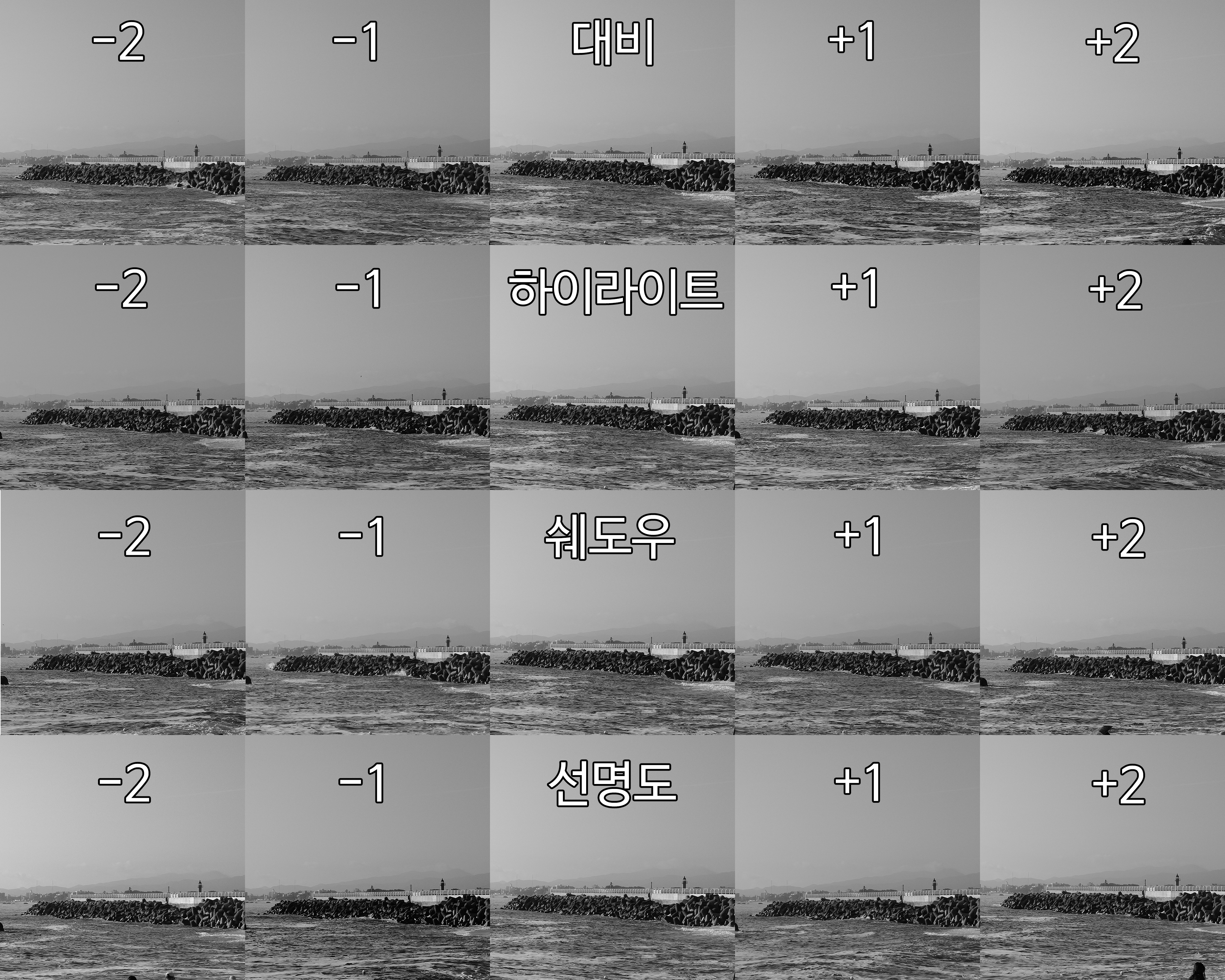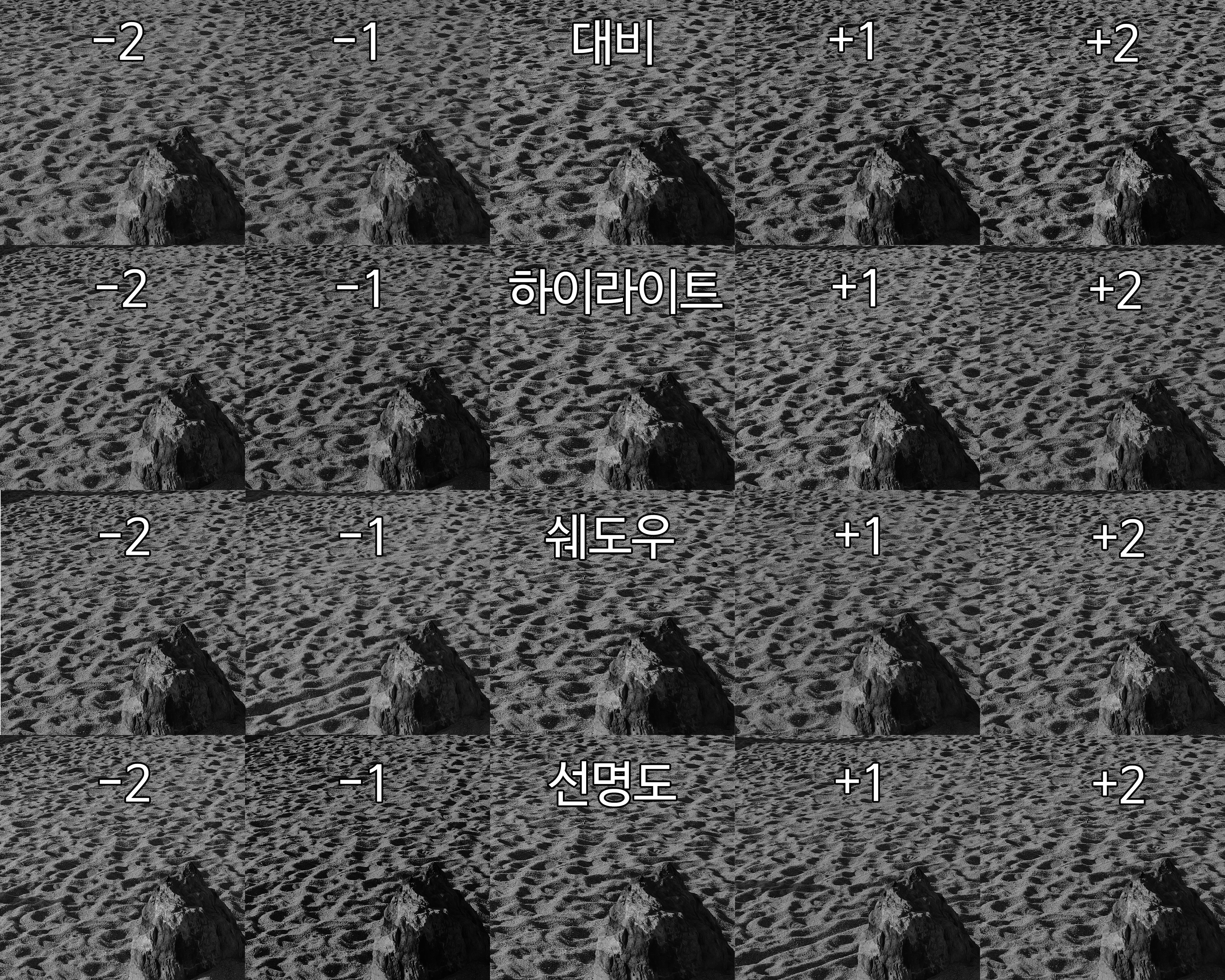 그런데 Q3는 고대흑백비 설정에 들어가면 대비, 하이라이트, 쉐도우, 선명도를 각각 -2, -1, 0, 1, 2로 설정할 수 있다.