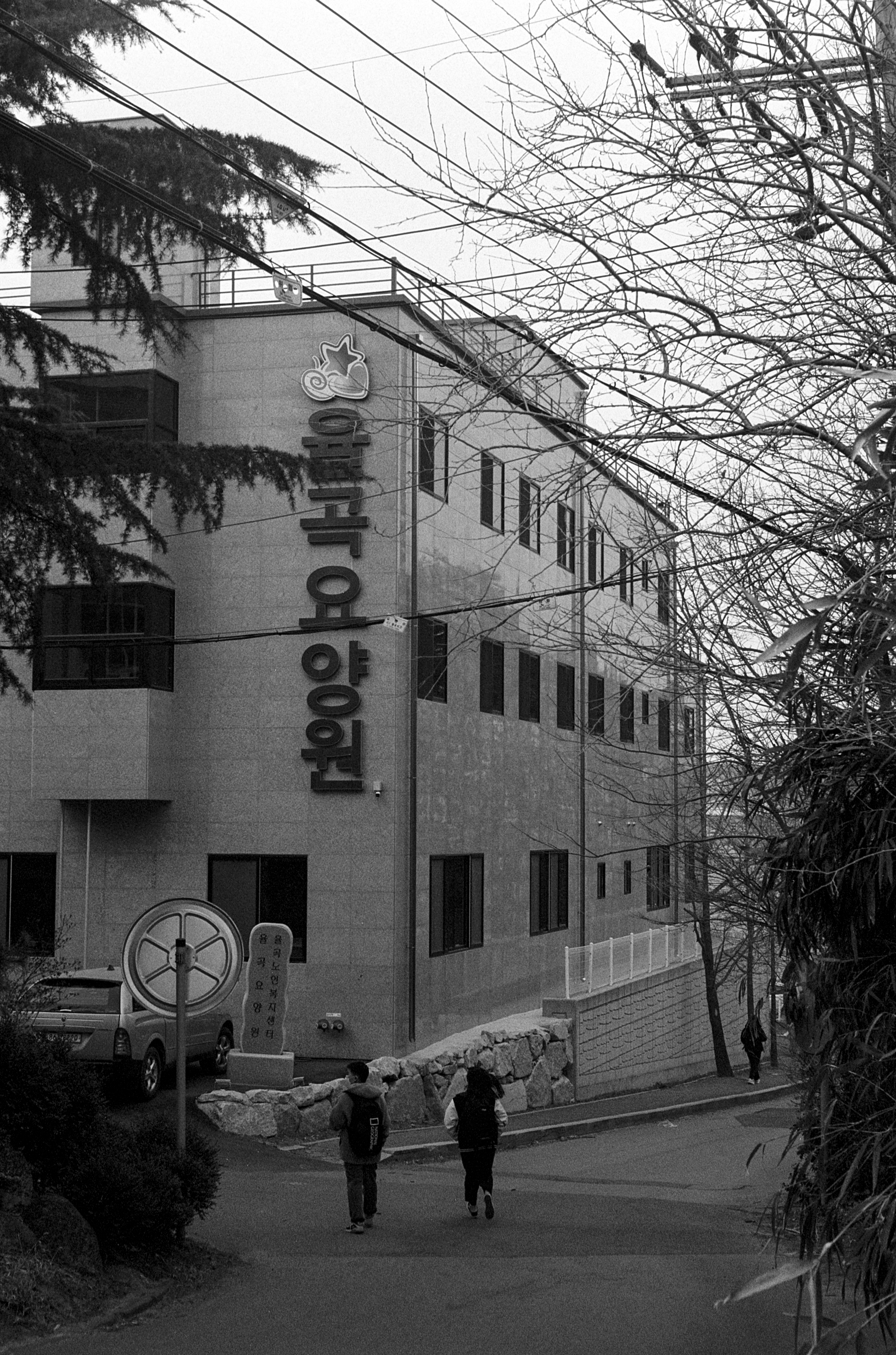 요양원 옆으로 지나가는 중학생들의 모습.