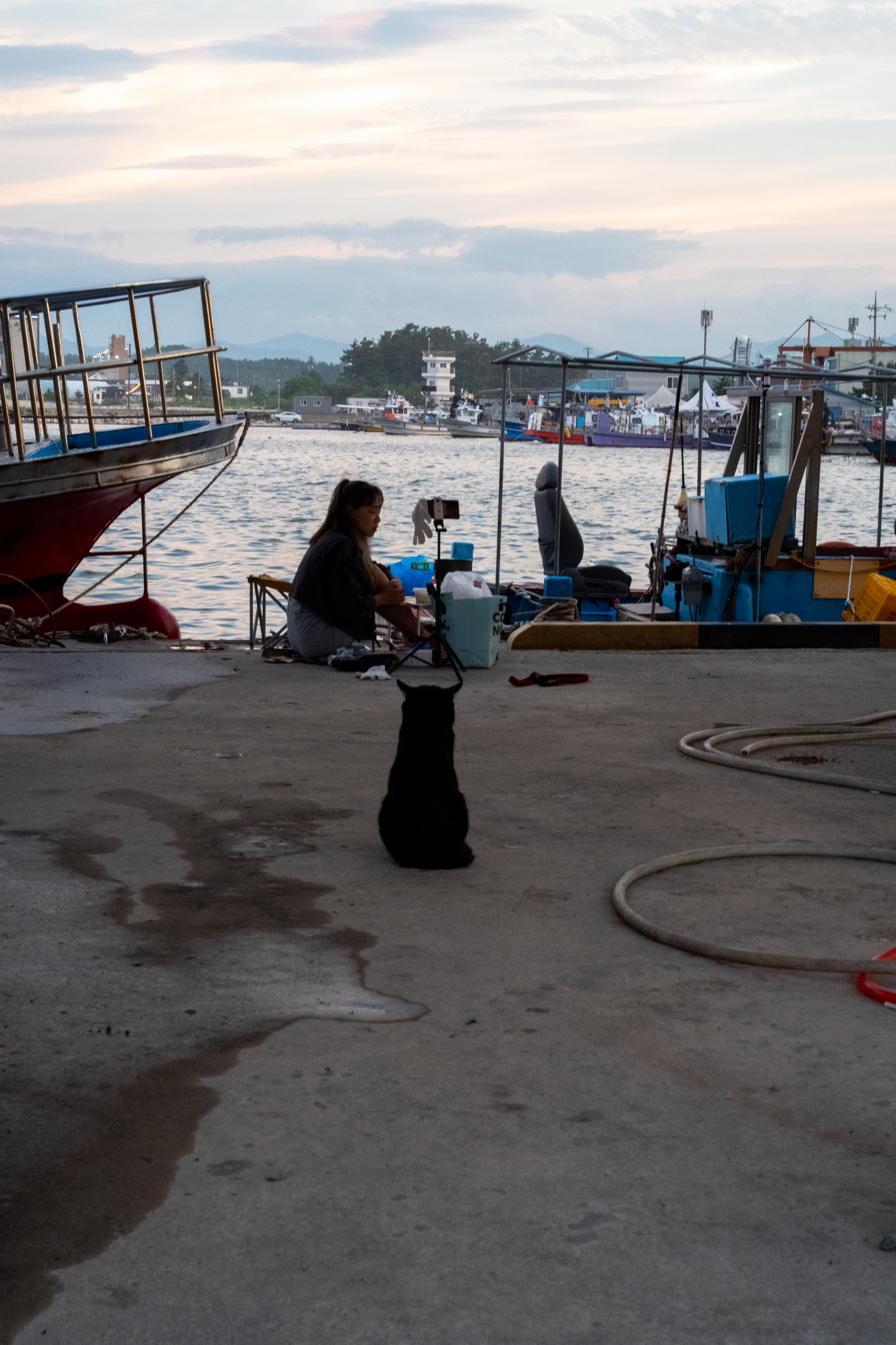 사천항에 방송을 하는 BJ에게 먹을 것을 얻어먹으러 가는 길고양이.